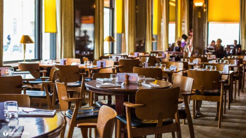 Interieur : de grote ruimte baadt in het licht dat door de hoge ramen binnenvalt. Het discrete en chique interieur met lederen stoeltjes en hout zorgt voor een warme ambiance